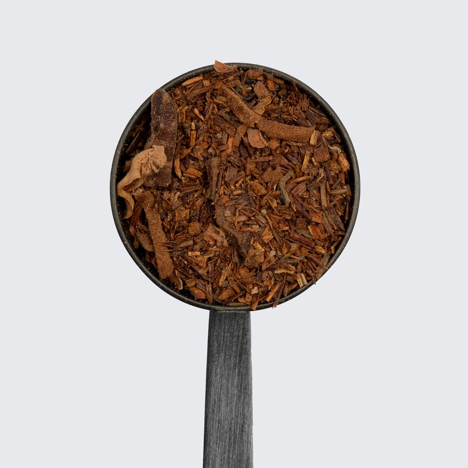 Rooibos, cranberries, coconut, vanilla, cocoa nibs, rose hips, anise seed, fennel seed, cocoa powder, monk fruit sweetener, maca powder, cardamom powder, cinnamon powder, ginger powder, nutmeg powder, rose bud & petals, pomegranate vanilla extract, safflower.